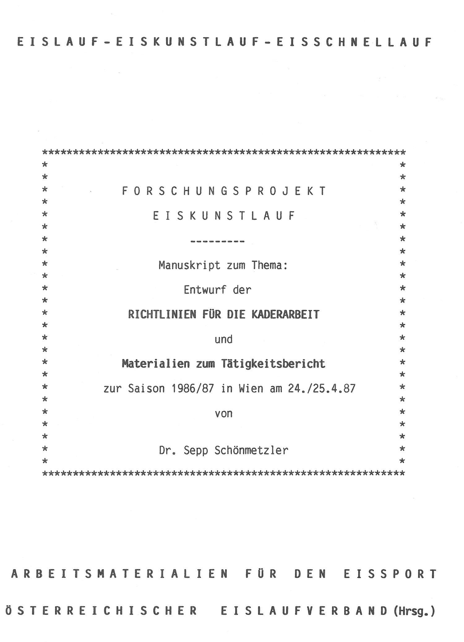 Forschungsprojekt Eiskunstlauf„Richtlinien für die Kaderarbeit und Materialien zum Tätigkeitsbericht“Saison 1986/87, 24.-25.4.1987 - Wien / Österreichvon Sepp Schönmetzler, Österreichischer Eislaufverband (Hrsg.)