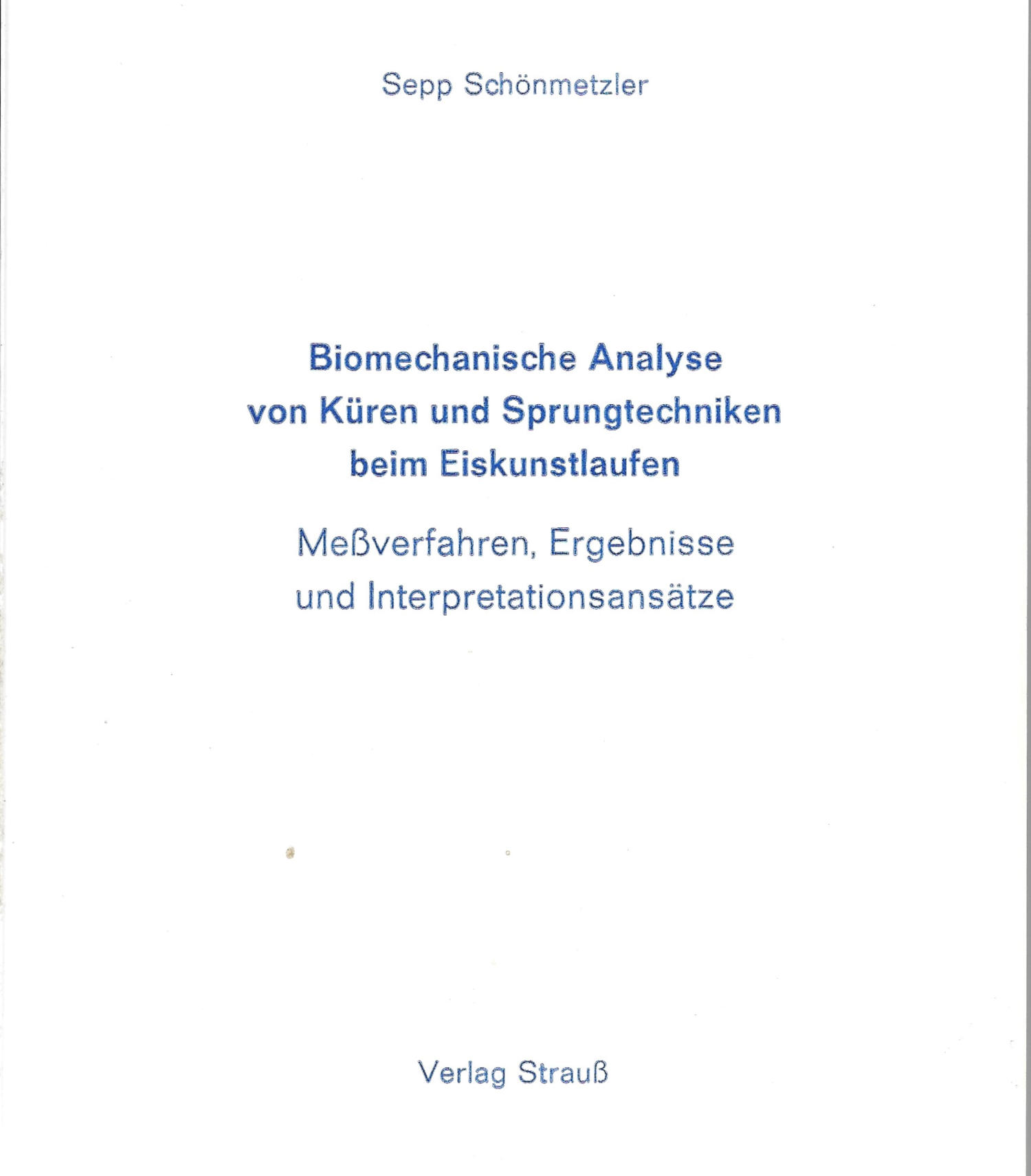 Biomechanische Analyse von Küren und Sprungtechniken beim EiskunstlaufenMeßverfahren, Ergebnisse und Interpretationsansätzevon Sepp SchönmetzlerZur Erlangung des akademischen Grades Doktor der Sportwissenschaften genehmigte Dissertation aus dem Institut für Biomechanik der Deutschen Sporthochschule Köln - vorgelegt im Jahr 1984.